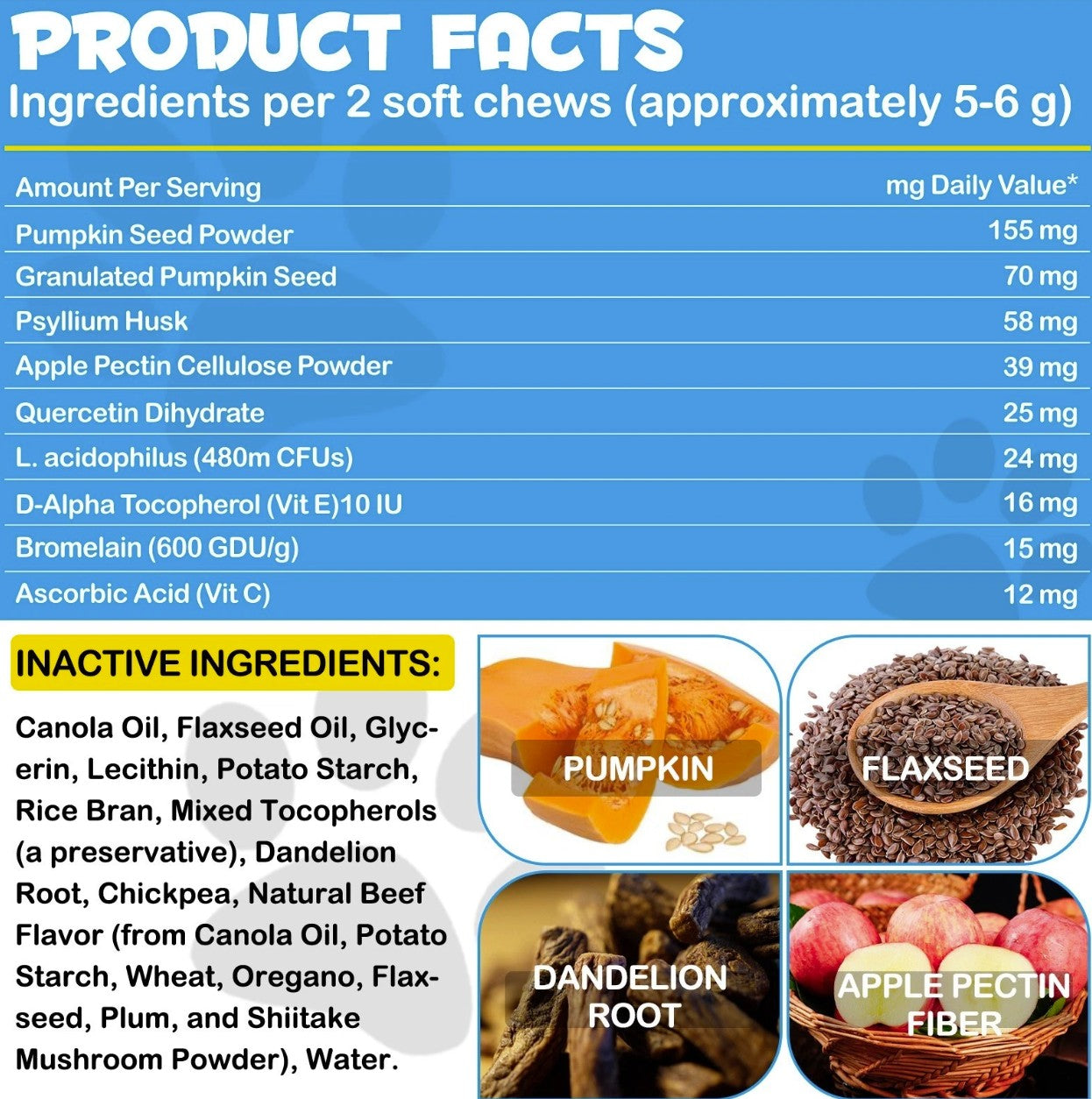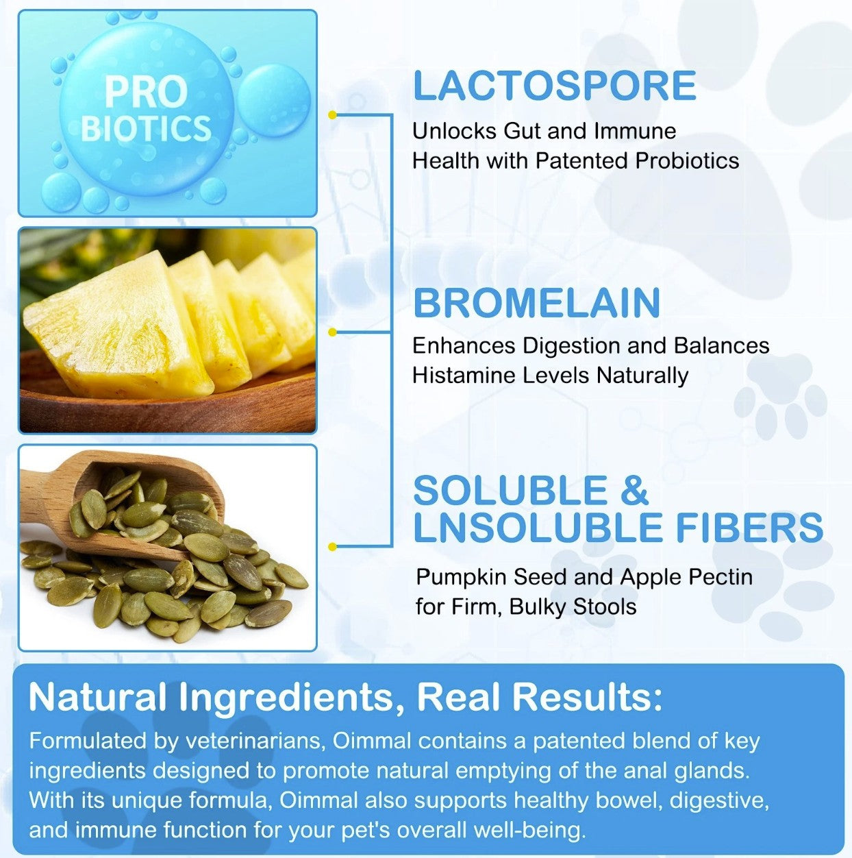 OIMMAI 150 Beef Flavor Pumpkin Soft Chews give your dog gentle support for bowel and anal gland health. Each jar includes 150 soft chews made with natural pumpkin seed powder, apple pectin, and psyllium husk to promote firm stools and help anal glands empty naturally. Enriched with probiotics and digestive enzymes, they aid digestion, support gut balance, and strengthen immune health. With a delicious beef flavor and no artificial fillers, these chews are perfect for dogs of all breeds and sizes as a daily wellness supplement.