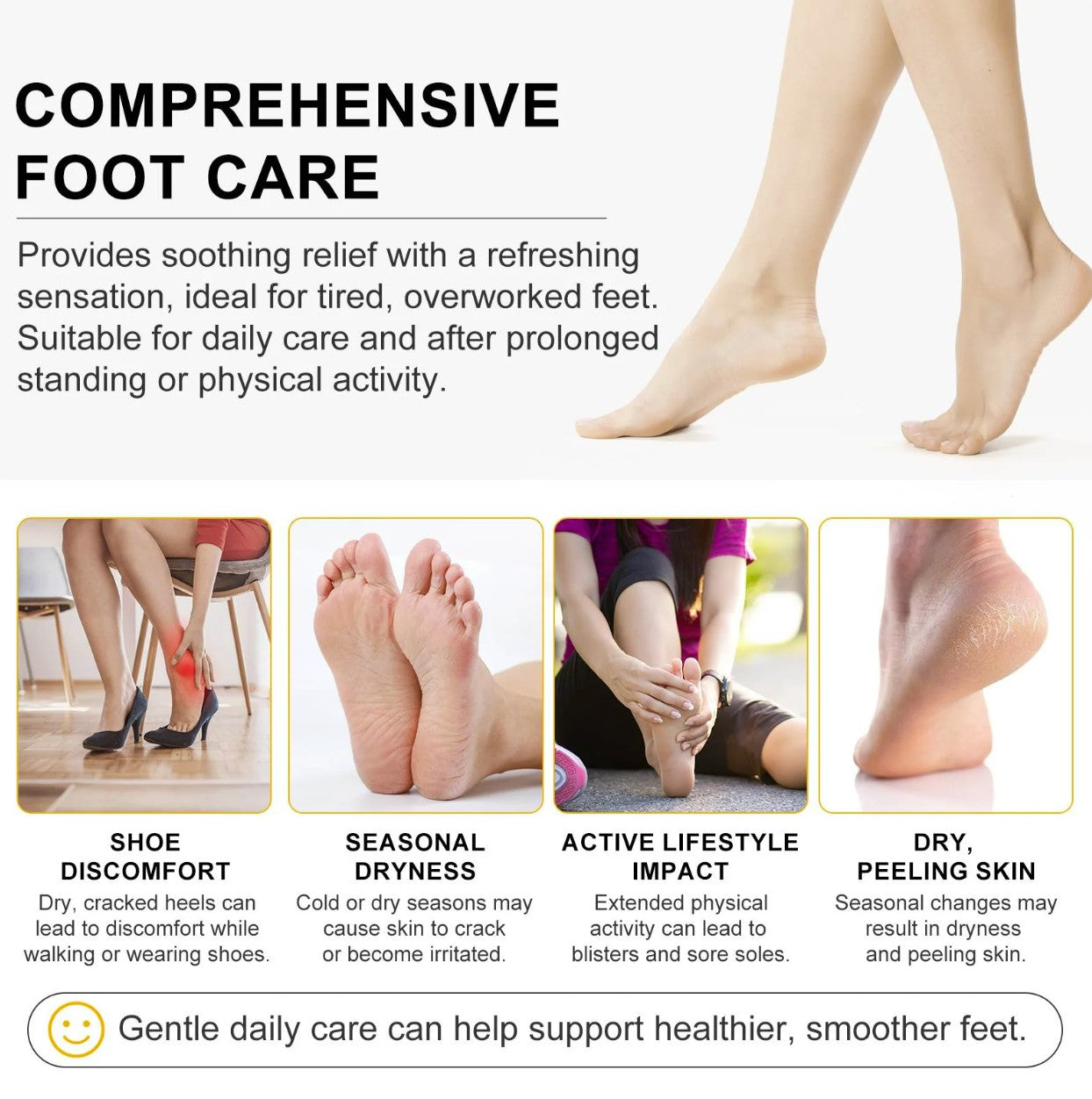 3. Concentrate on dry areas, such as heels and the balls of your feet. For best results, apply daily, especially after work or physical activity.