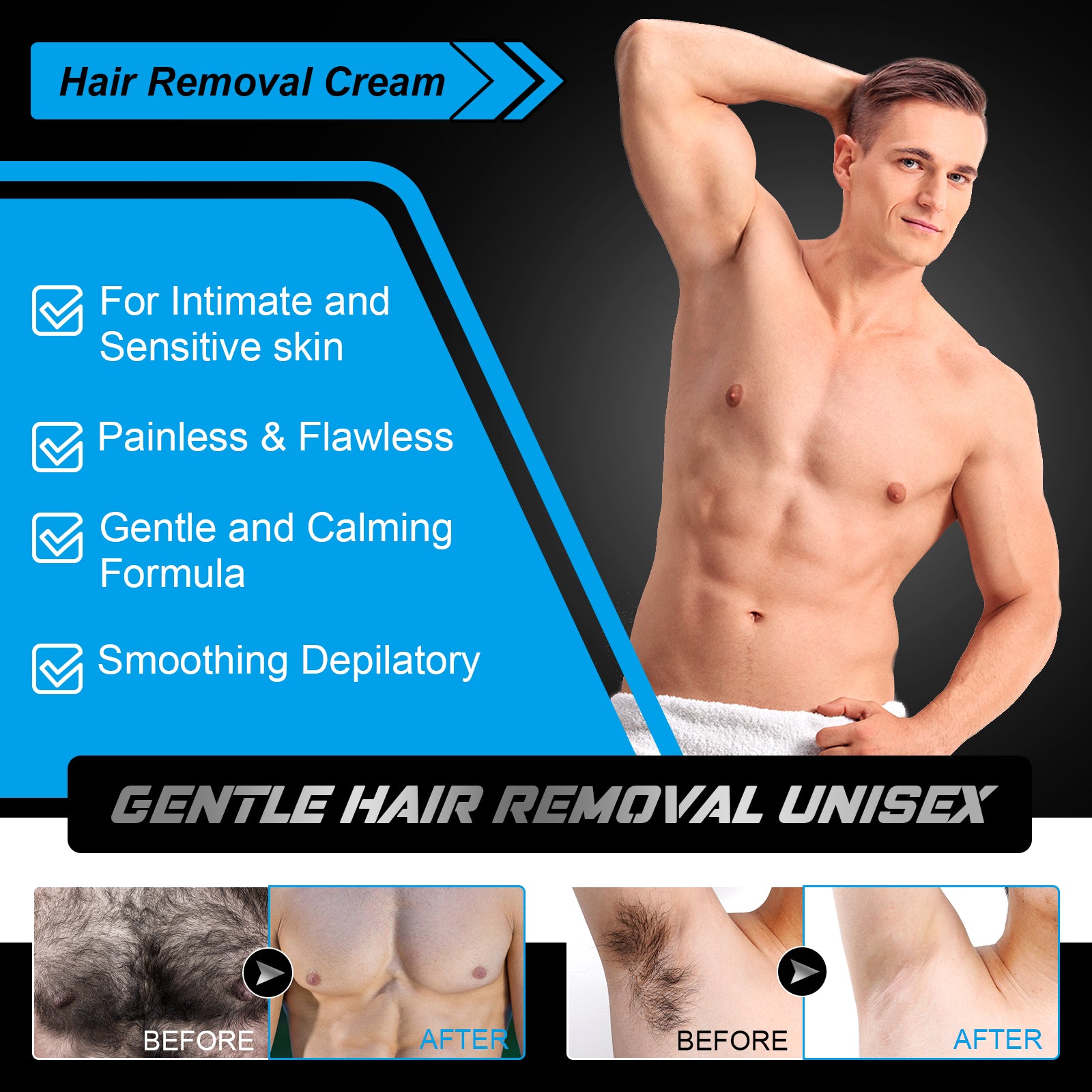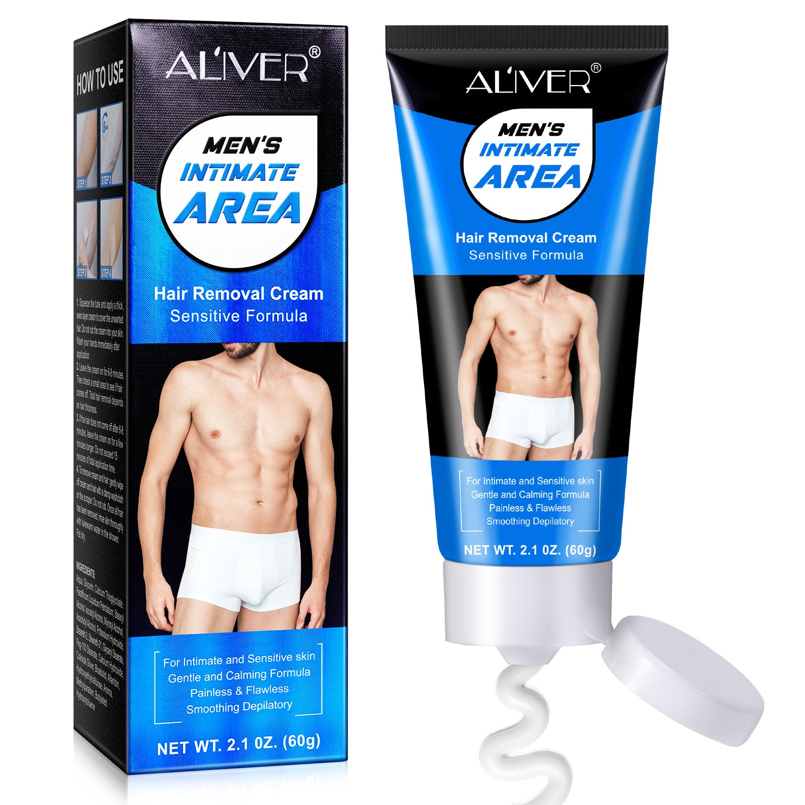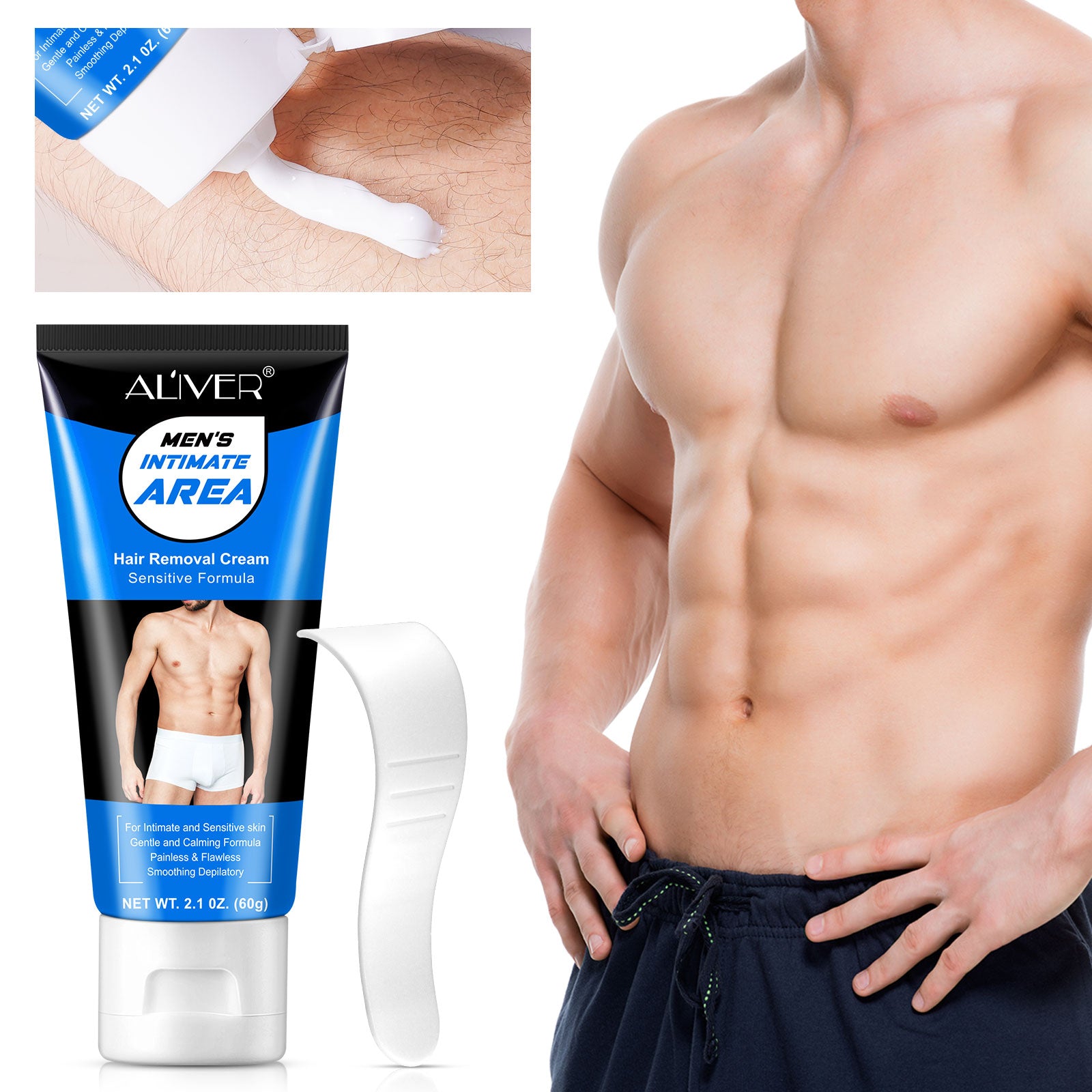 ALIVER Men’s Intimate Hair Removal Cream – Gentle, painless formula designed for sensitive skin and intimate areas. Effectively removes unwanted hair from chest, underarms, legs, and private parts for smooth, flawless results. Enriched with soothing ingredients like bisabolol, allantoin, and colloidal silver to calm and protect skin.